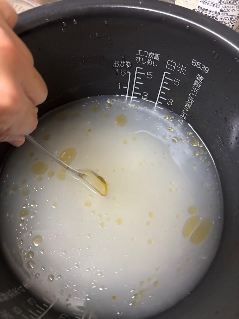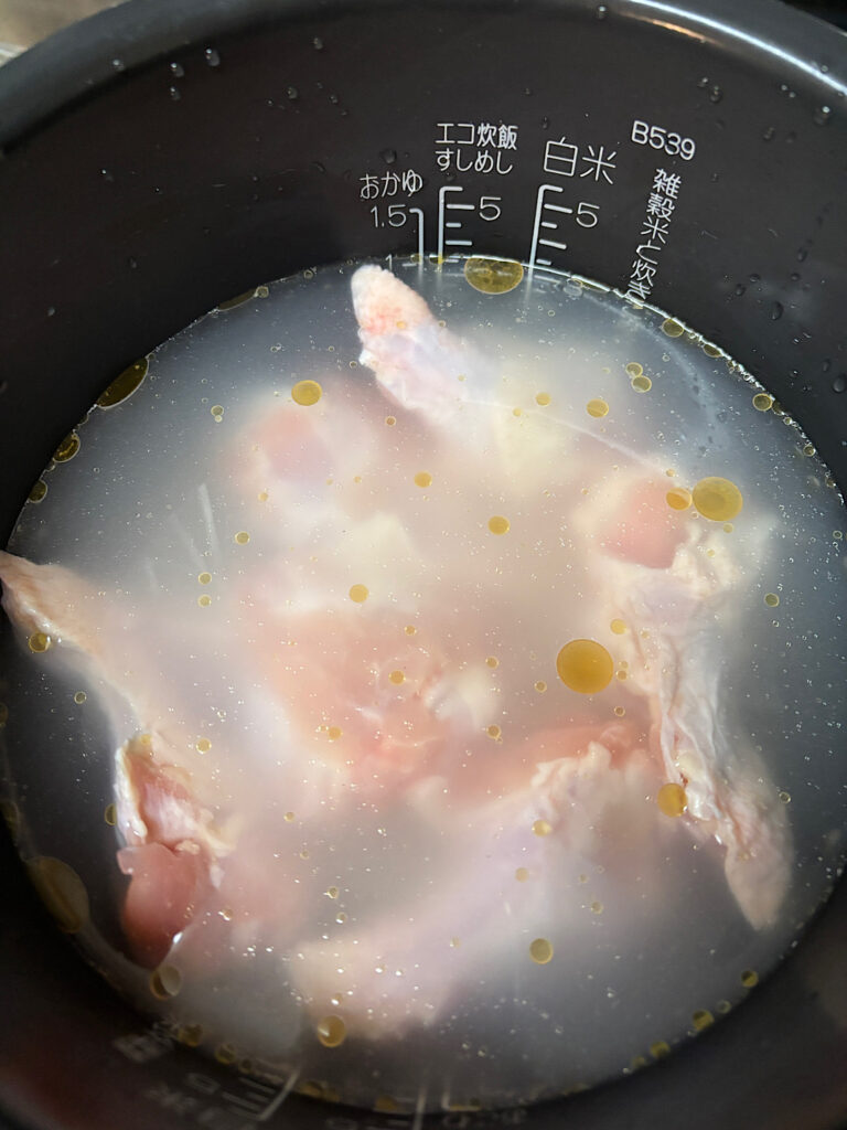 お米を洗い七草と手羽元以外の材料を入れて混ぜておきます。