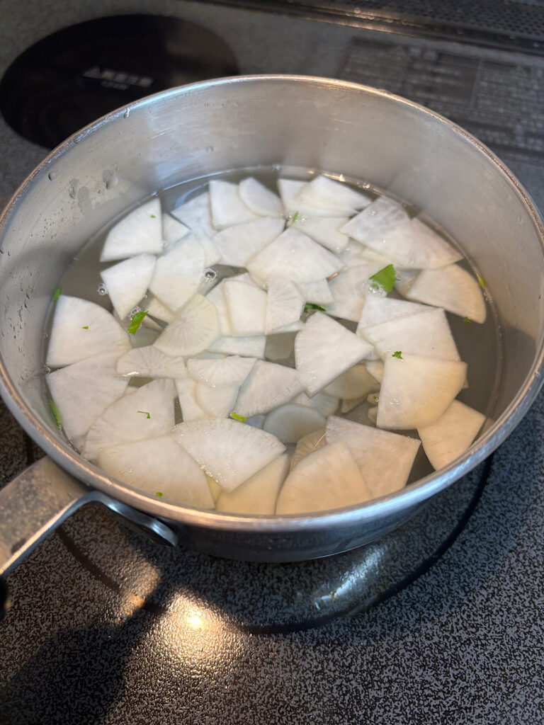 鍋に分量外の水とすずなとすずしろを入れて火にかけ沸騰させます。