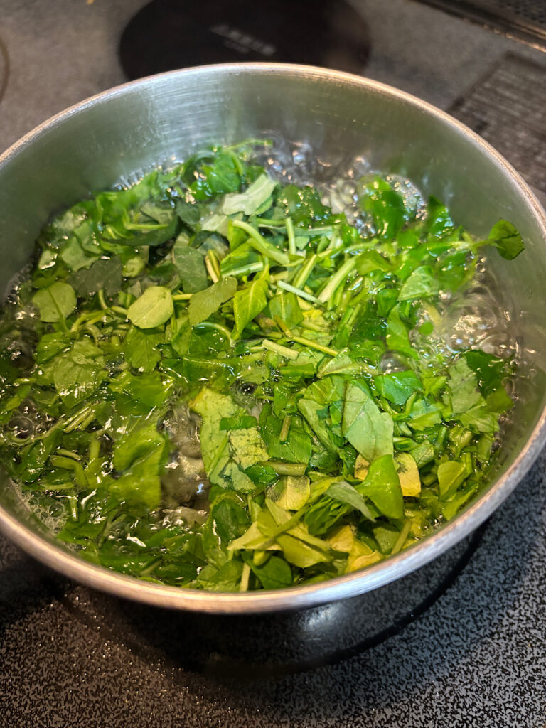 沸騰したところに葉物を入れてサッと茹でてザルに上げておきます。