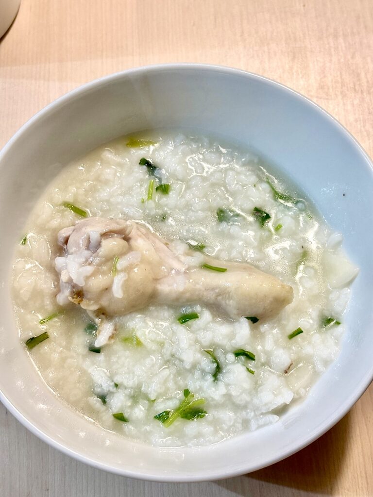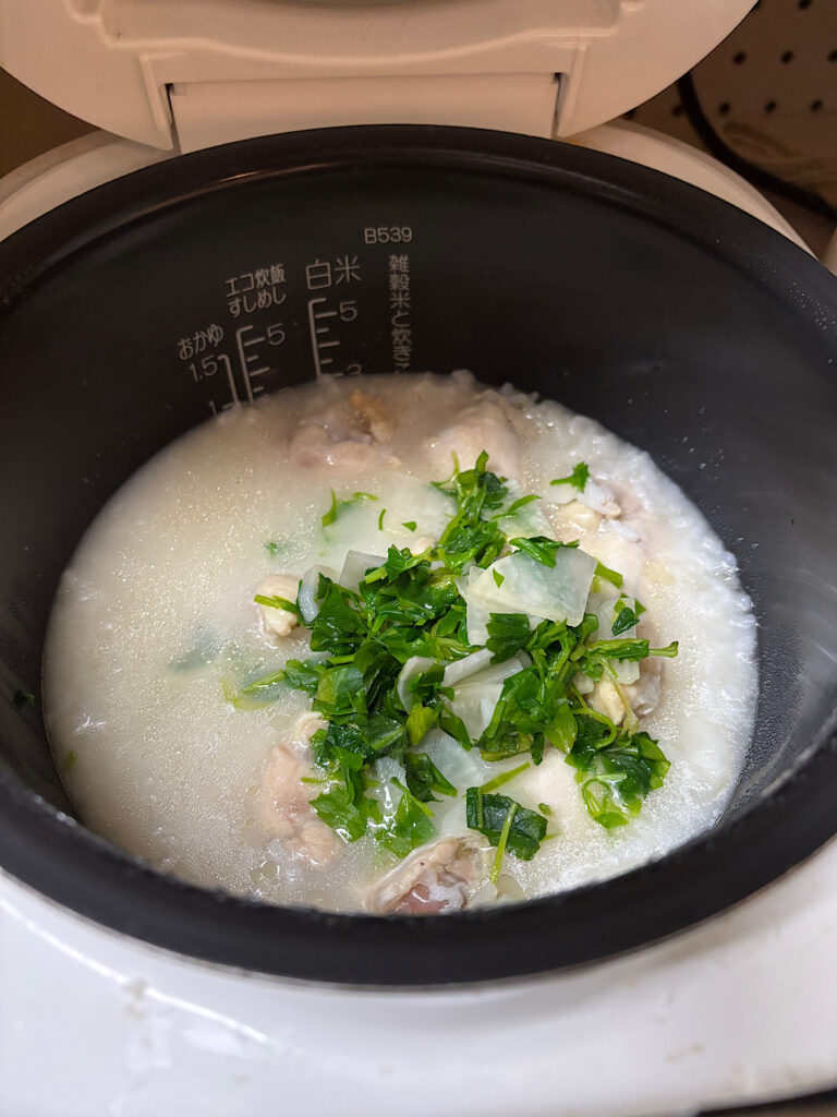 参鶏湯はお米がもっと少ないので減らして生姜の輪切りを入れるとそれらしくなります。