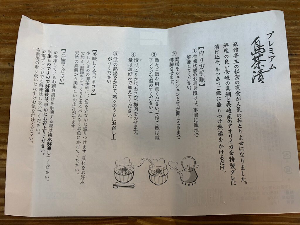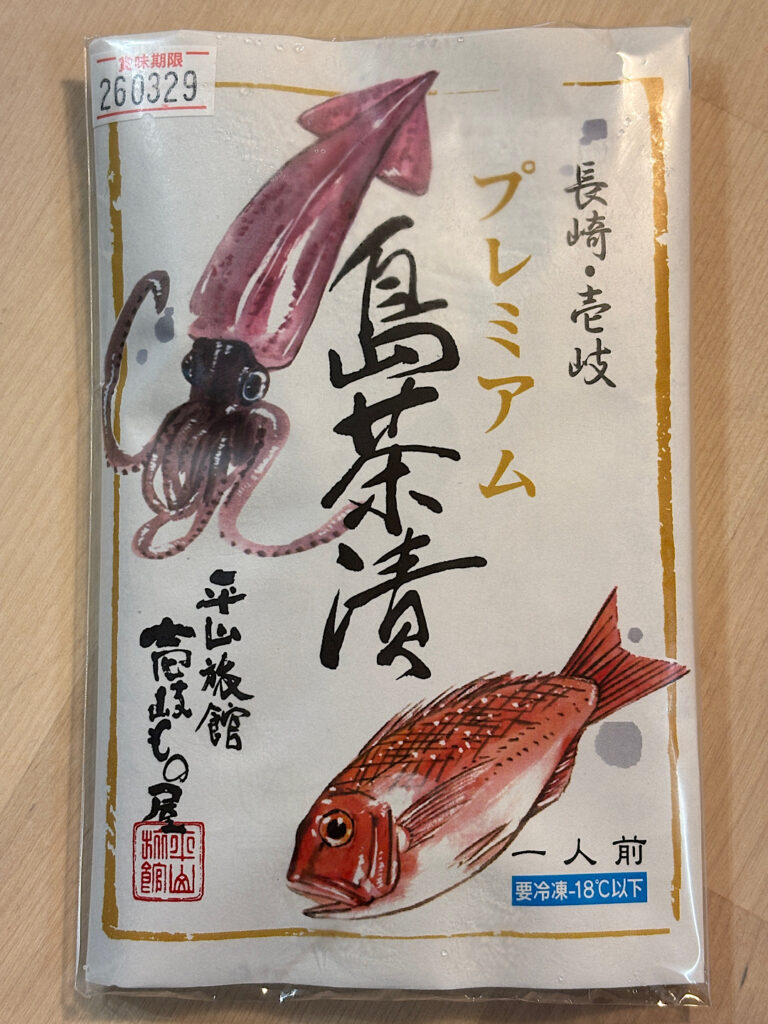 島茶漬けというのは、壱岐の天然の鯛と天然のイカを自家調合の醤油だれに漬け込んだものをお湯をかけてお茶漬けにするものです。