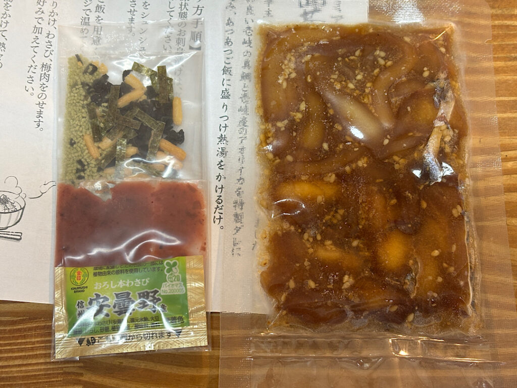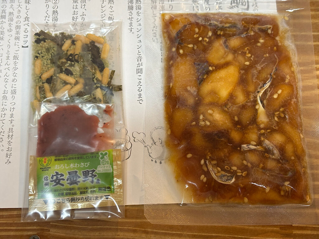 鯛とイカ漬け、お茶漬けの素、梅干し、わさびが入っています。