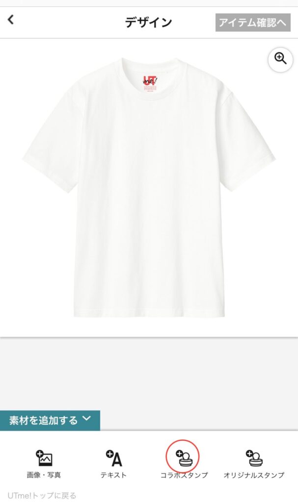 好きなスタンプを押すとTシャツにひとまずのりますが、このままでは大きさや位置がわからないので右上の虫眼鏡を押して全体をみます。